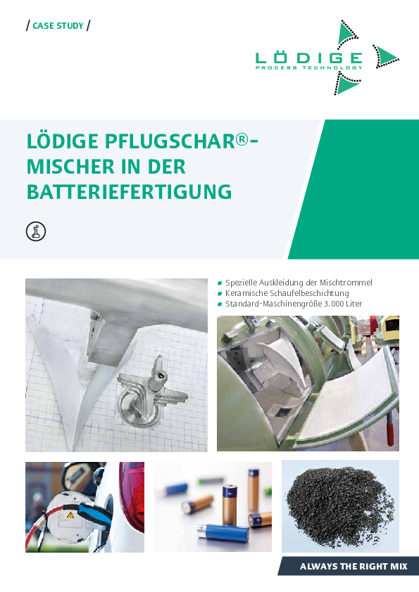 LÖDIGE entwickelt fortschrittliche Lösungen für die Batterieproduktion – insbesondere für die Herstellung der entscheidenden Kathoden- und Anodenmassen, die die Qualität der Batterien maßgeblich bestimmen. Unsere Hochleistungsmischer definieren die Qualitätsstandards in der Produktion neu und unterstützen die Industrie dabei, den wachsenden Anforderungen an Effizienz und Leistungssteigerung gerecht zu werden.