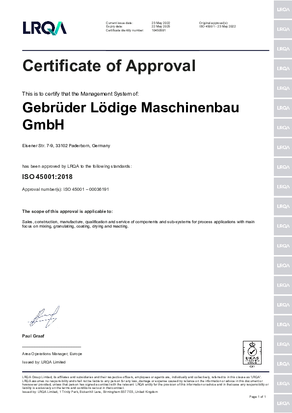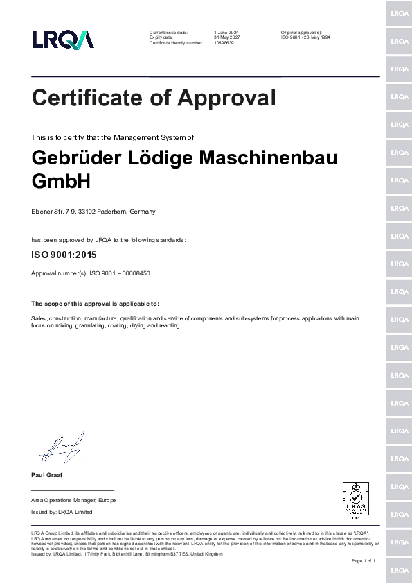 Our Quality Assurance System has been certified in accordance with Annex IV of Directive 2014/34/EU. This certificate is used to maintain our type approval for the manufacture of machinery that may be used in potentially explosive atmospheres.