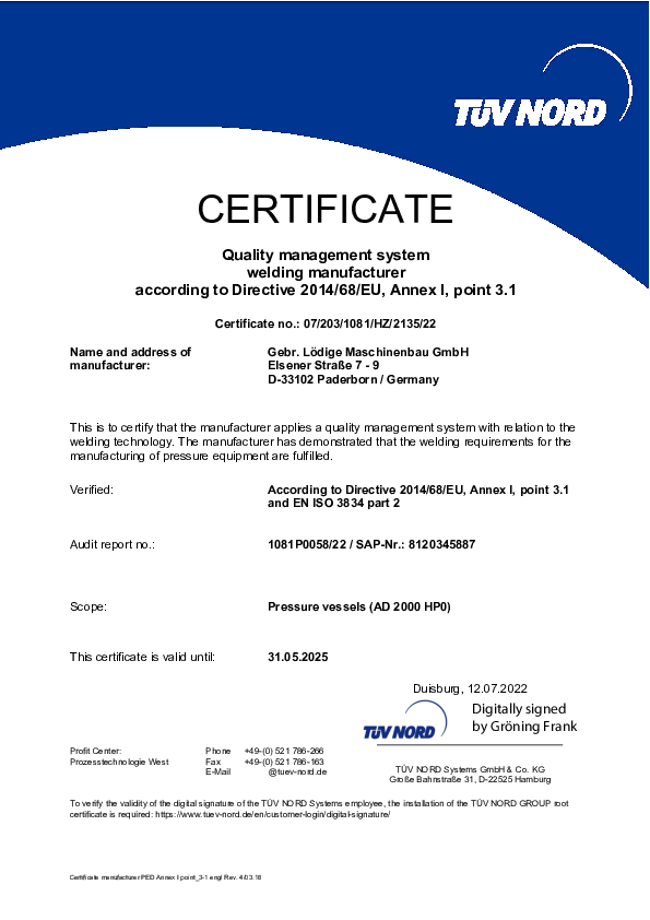 Certificate for the manufacture of pressure vessels in accordance with Directive 2014/68/EU Modules A, A2 and G and national regulations AD 2000 HP0.