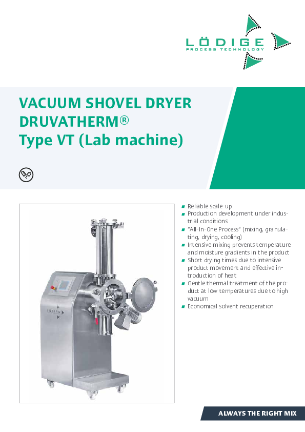 The Lödige laboratory vacuum shovel dryer DRUVATHERM® is a horizontal, batch vacuum dryer with a frequency-controlled mixing tool. This mixer consisting of mixing elements adapted to the process and arranged on a shaft according to a specific system - is installed in a cylindrical mixing drum equipped with a temperature control jacket. Rotation of the mixing unit generates a three-dimensional product movement, in which all of the product is constantly in motion. The contact frequency of particles with the heat exchange surface (heated wall of the device) generated by this mechanically generated fluid bed leads to shorter drying times.