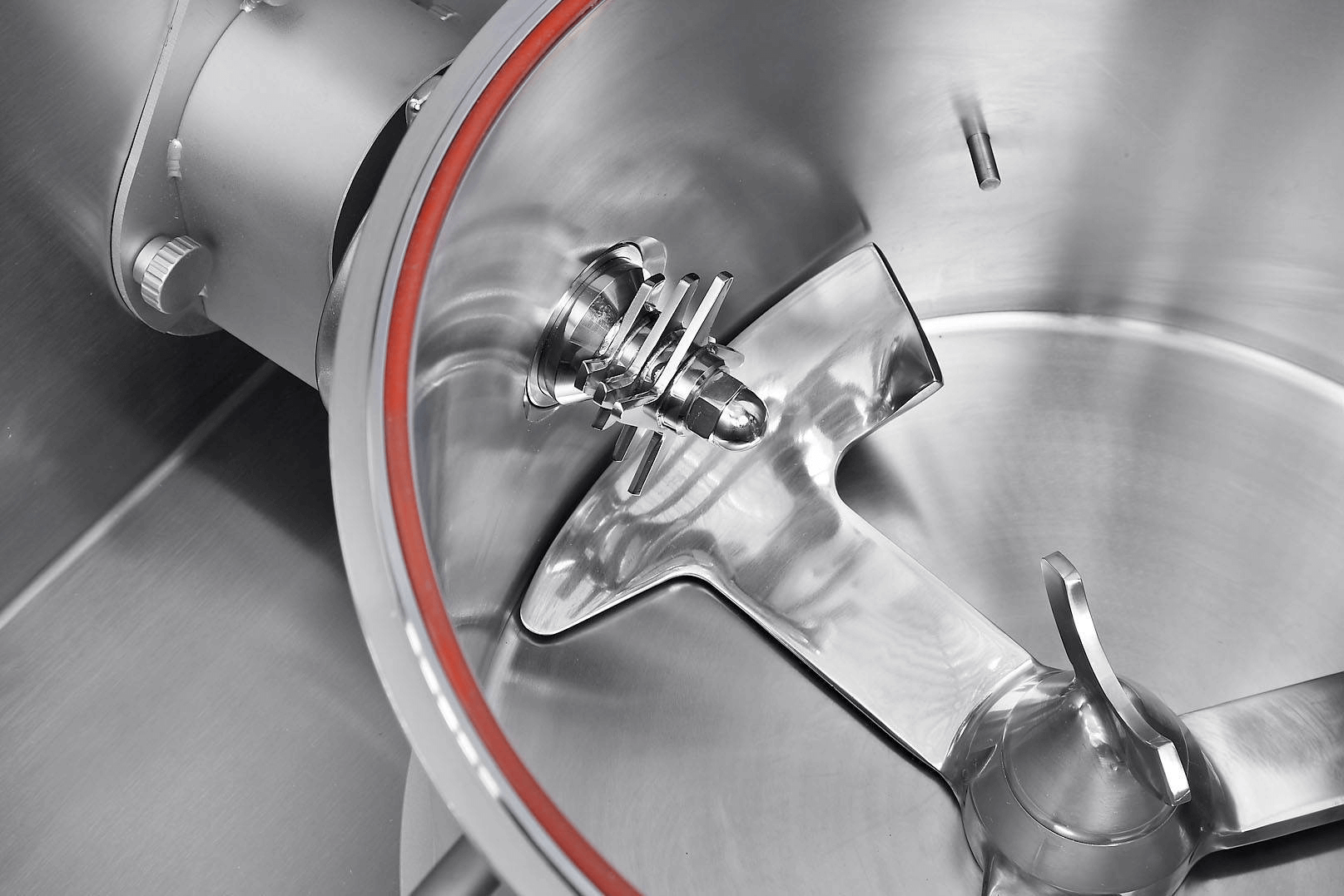 Am Boden des vertikalen, zylindrischen Mischbehälters rotiert ein dreiflügeliges Mischwerkzeug, dass das Mischgut in einen trombenförmigen Umlauf versetzt. Es werden sehr kurze Mischzeiten und eine hervorragende Mischgüte erreicht, selbst wenn die Produktkomponenten extreme Unterschiede aufweisen. Der separat angetriebene Messerkopf (nur bei 5-, 10- und 15-l-Behälter) dient bei Bedarf zum Aufschließen von Agglomeraten, zur gleichmäßigen Befeuchtung, Feuchtgranulierung und zur strichreinen Einmischung von Farbstoffen.