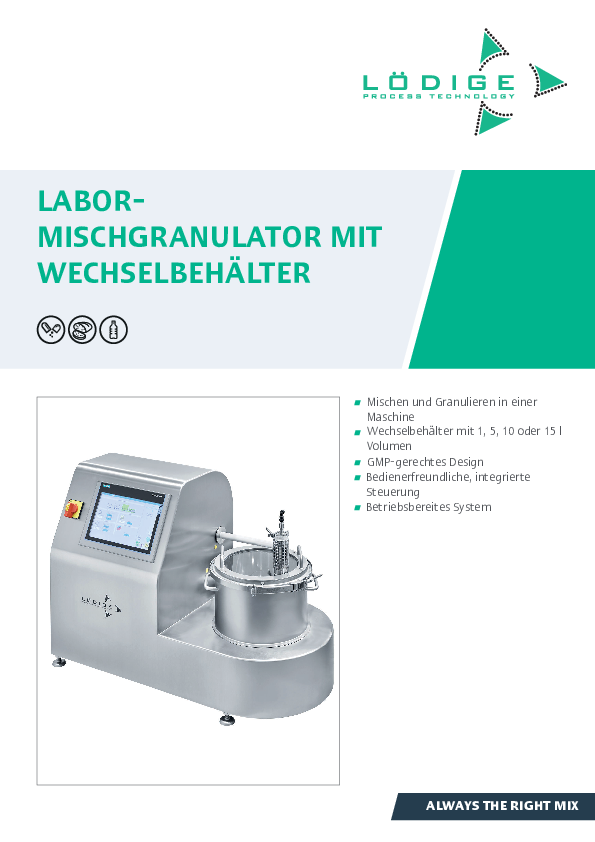 Das Labormodell komplettiert die bewährte Baureihe der Lödige-Mischgranulatoren. Im Labor-Mischgranulator können die gleichen Prozessschritte wie in den Produktionsmaschinen durchgeführt werden: