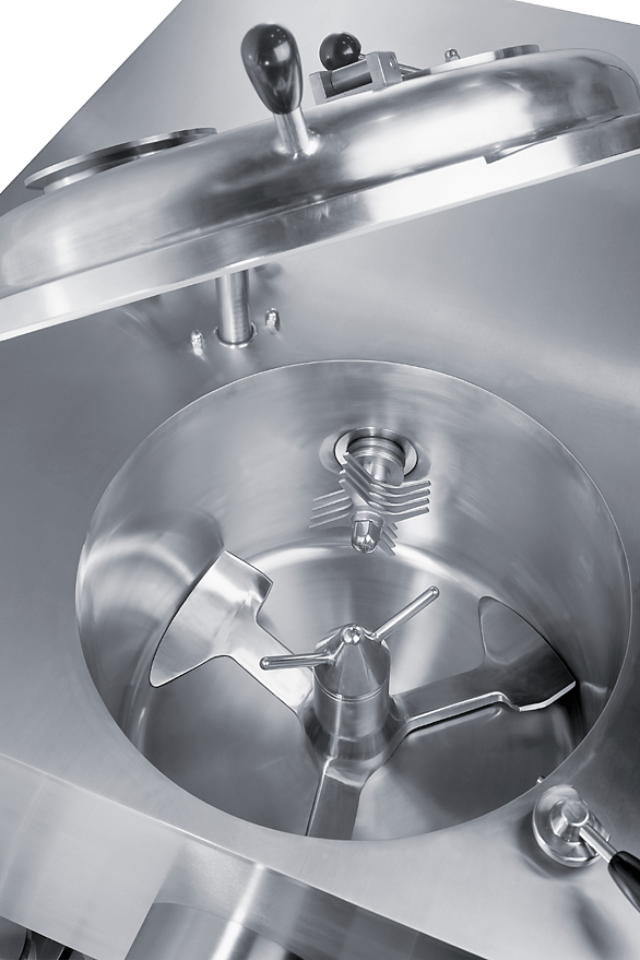 Der High-Shear-Mischer ist ein System zum Mischen, Granulieren und Sieben von pharmazeutischen Pulvern und Granulaten. Darüber hinaus ist er für ein weites Spektrum an Kosmetik- und Lebensmittelprodukten geeignet. In einem vertikal angeordneten, zylindrischen Mischbehälter rotiert mit geringem Abstand zu Behälterwand und -boden ein dreiflügeliges Mischwerkzeug. Form und Umfangsgeschwindigkeit des Mischwerkzeugs bringen das Mischgut in einen trombenförmigen Umlauf. Diese Produktbewegung führt zu kürzesten Mischzeiten, kombiniert mit einer hervorragenden Mischgüte, und ermöglicht einen gezielten Aufbau von Granulaten. Ein separat angetriebener Messerkopf dient zum Aufschließen evtl. vorhandener Agglomerate sowie zur gleichmäßigen Befeuchtung und Granulierung. Die Flüssigkeitszugabe erfolgt wahlweise gravimetrisch oder mit einer Pumpe direkt in den Wirkungsbereich des Messerkopfes, um eine bestmögliche Verteilung zu gewährleisten. Das optionale Feuchtsieb an der Entleerung erzeugt eine vollkommen homogene Größenverteilung der Granulate.