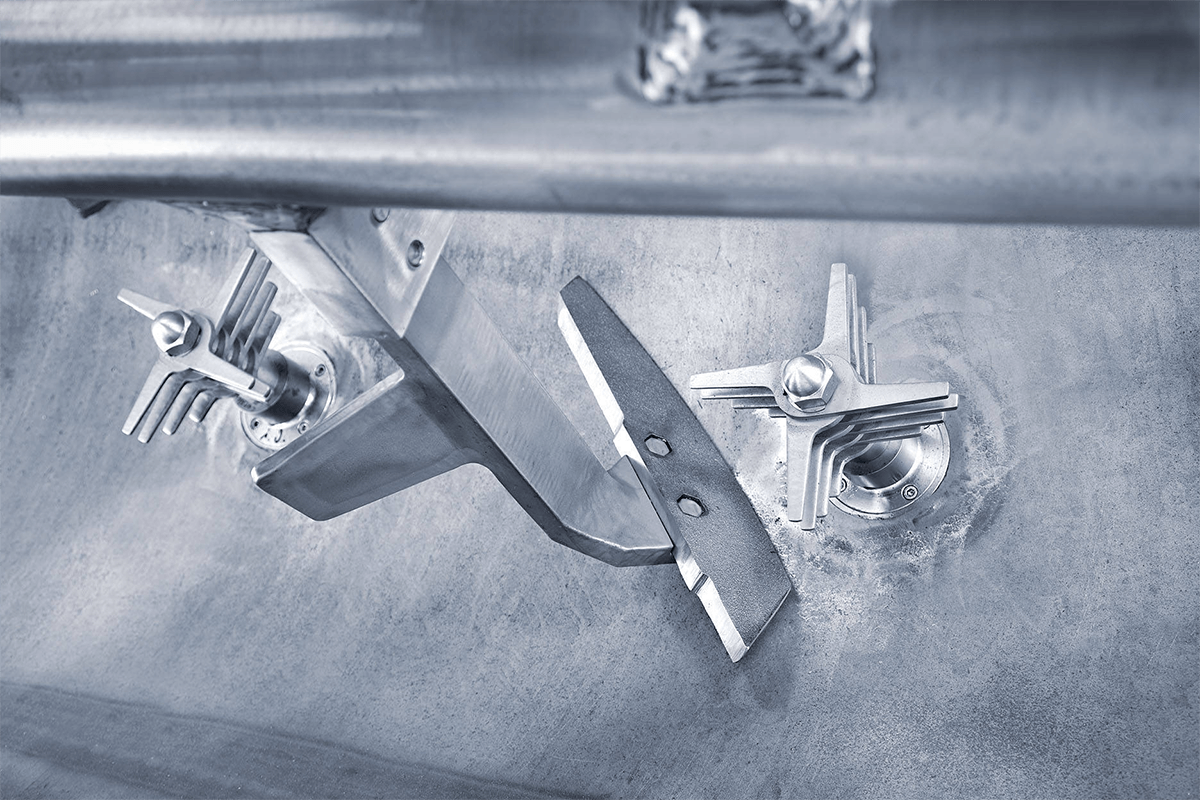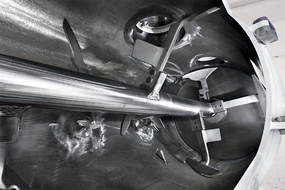 Der optionale Einbau von Messerköpfen in die Mischtrommel erhöht lokal die Turbulenz in der Mischzone extrem. Dies stellt die Vermischung auch feinster Partikel in kleinster Menge sicher und ermöglicht auch das Aufschließen von Agglomeraten hin zu Primärpartikeln.