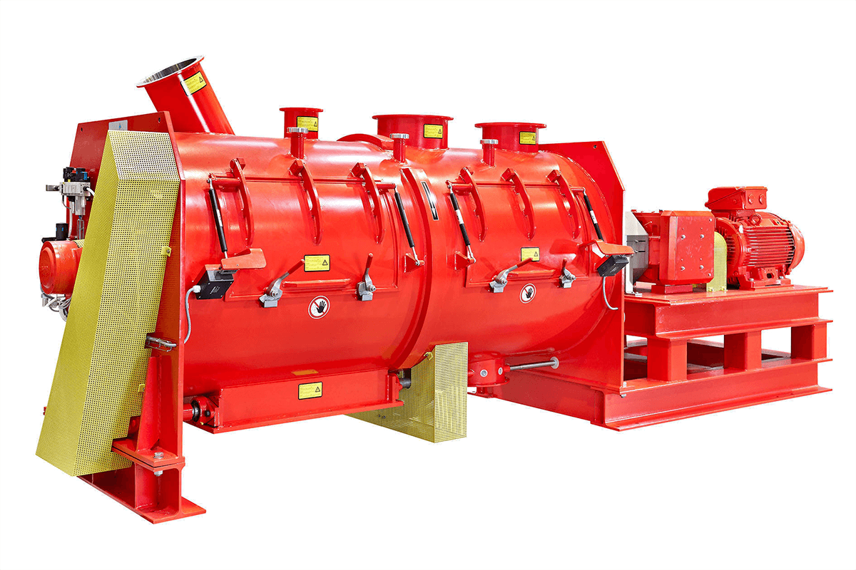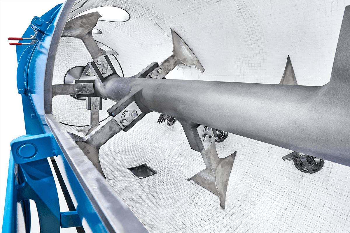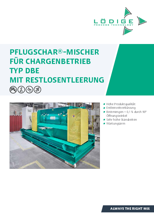 Pflugschar®-Mischer für Chargenproduktion des Typs DBE erfüllen die Forderungen nach größten Durchsätzen und hoher Mischgüte im produktionsbedingten Chargenbetrieb. Die Konstruktion dieses Mischertyps mit einer über die gesamte Trommellänge ausgeführten Auslauföffnung berücksichtigt die Forderung nach nahezu rückstandsfreier Produktentleerung in kürzester Zeit.