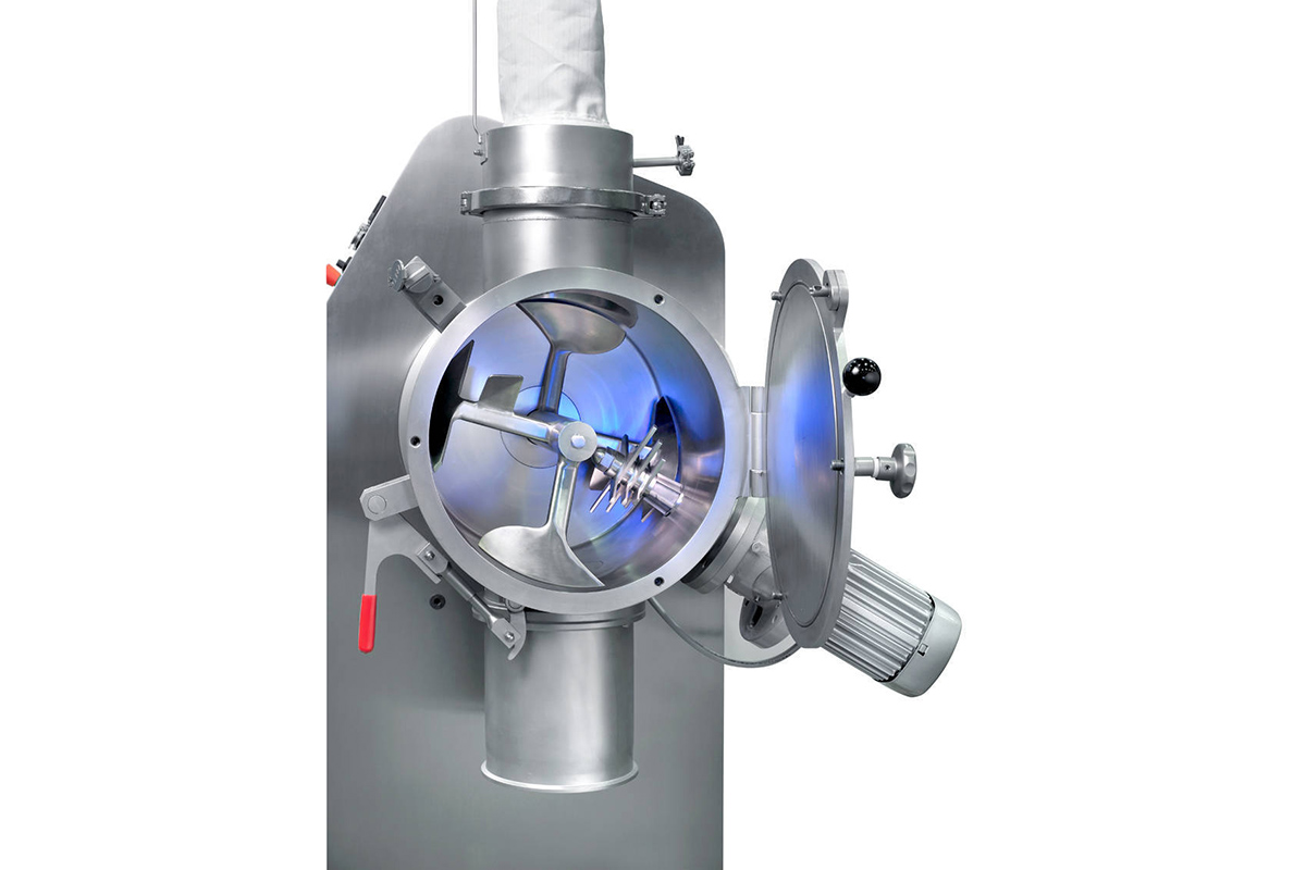 Der optionale Einbau von Messerköpfen in die Mischtrommel erhöht lokal die Turbulenz in der Mischzone extrem. Dies stellt die Vermischung auch feinster Partikel in kleinster Menge sicher und ermöglicht auch das Aufschließen von Agglomeraten hin zu Primärpartikeln.