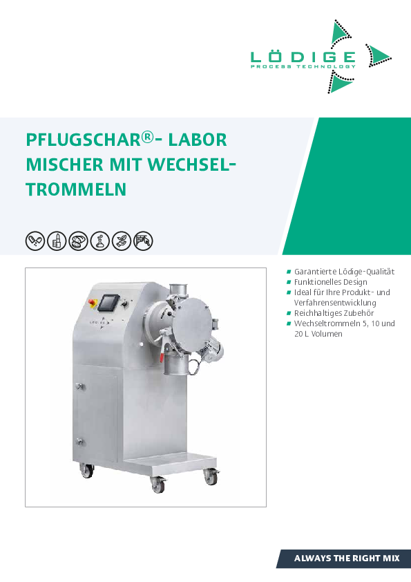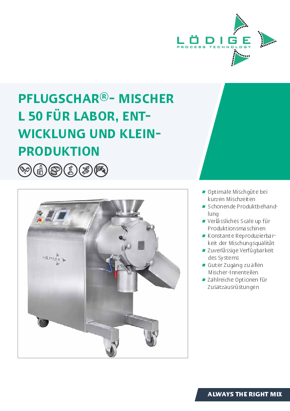 Die Lödige Labormischer vom Typ L5, L10, L20 und L50 haben ein Gesamtvolumen entsprechend ihres Produktnamens von 5, 10, 20 oder 50 l. Sie verbinden die gewohnte Mischqualität mit reichhaltiger Ausstattung zur Anpassung an die unterschiedlichsten Anforderungen.