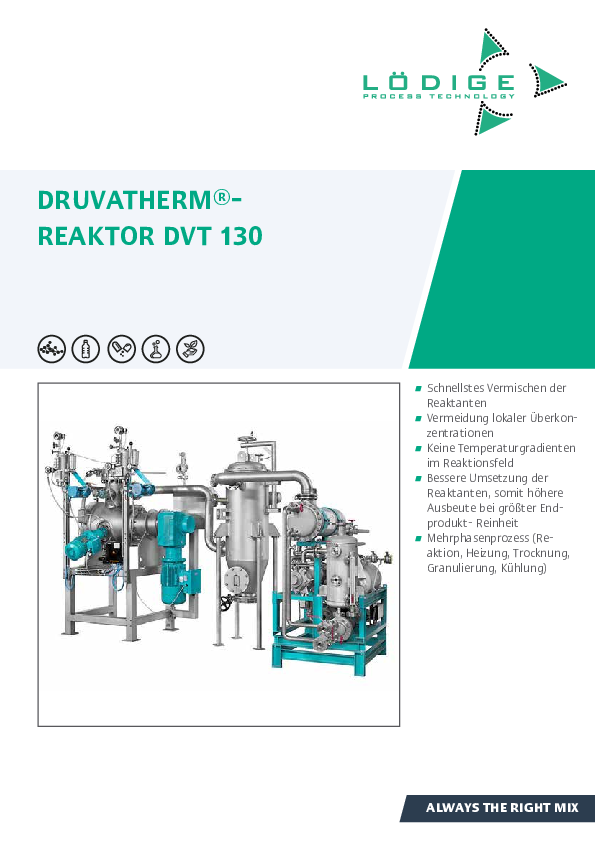 Die Lödige-DRUVATHERM®-Reaktoren sind diskontinuierliche, schnelllaufende Reaktoren. Durch rotierende, prozessangepasste Mischelemente, eingebaut in einer zylindrischen, mit Temperiermantel versehenen Trommel, wird eine dreidimensionale Produktbewegung generiert. Die hieraus resultierende hohe Kontakthäufigkeit der Reaktanten untereinander führt zu einer effektiven Umsetzung bei höchster Ausbeute.