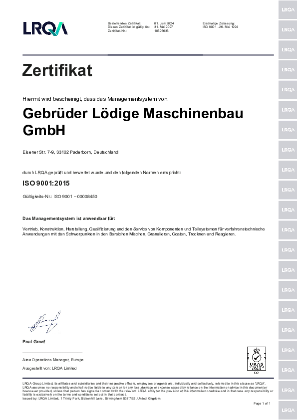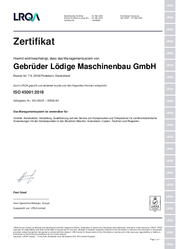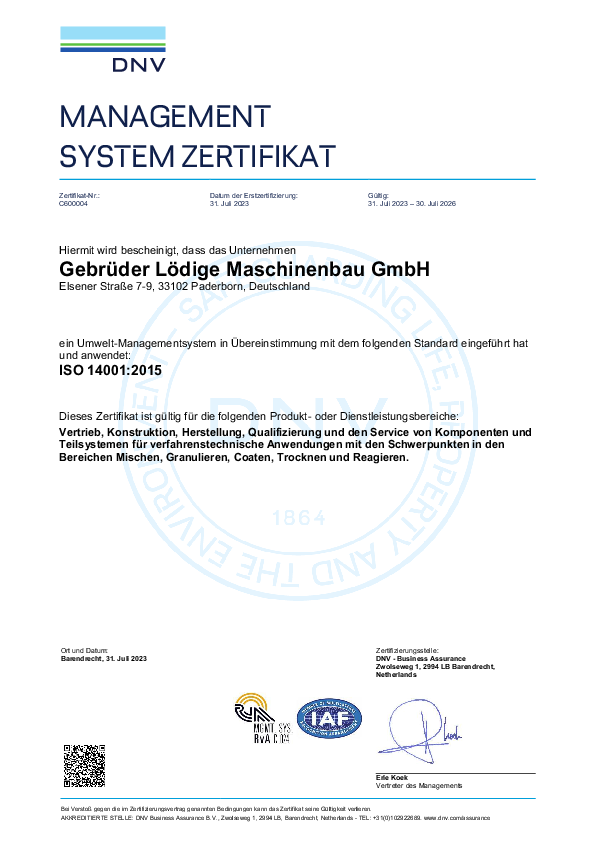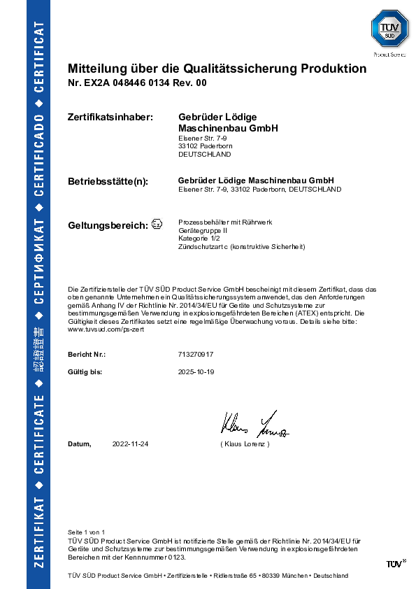 Unser Qualitätssicherungssystem wurde gemäß Anhang IV der Richtlinie 2014/34/EU zertifiziert. Dieses Zertifikat dient zur Aufrechterhaltung unserer Baumusterprüfungen für die Herstellung von Maschinen, welche in explosionsfähigen Atmosphären eingesetzt werden dürfen.