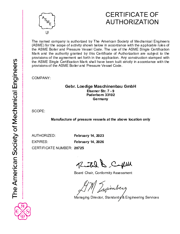 Zertifikat zur Herstellung von Druckbehältern nach Regelwerk ASME Section VIII-1 Druckbehälterbau „U“ Designator.