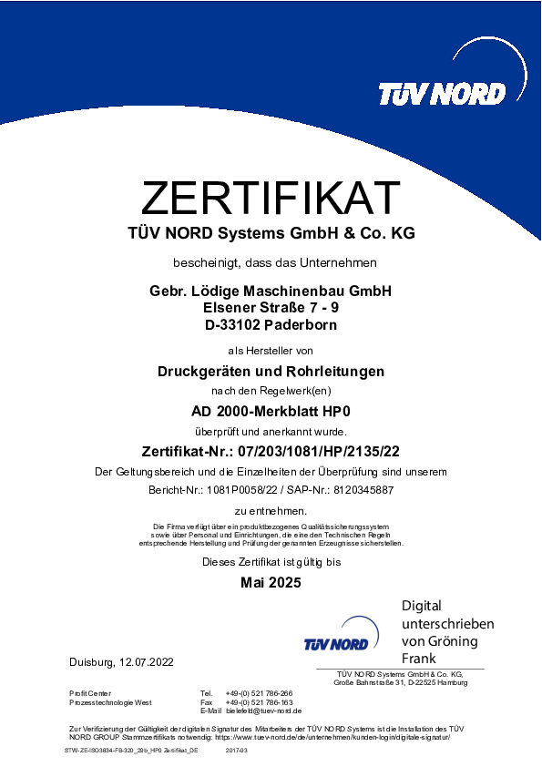 Zertifikat zur Herstellung von Druckbehältern in Verbindung mit RL 2014/68/EU Modul A, A2 und G sowie mit dem nationalen Regelwerk AD 2000 HP0.